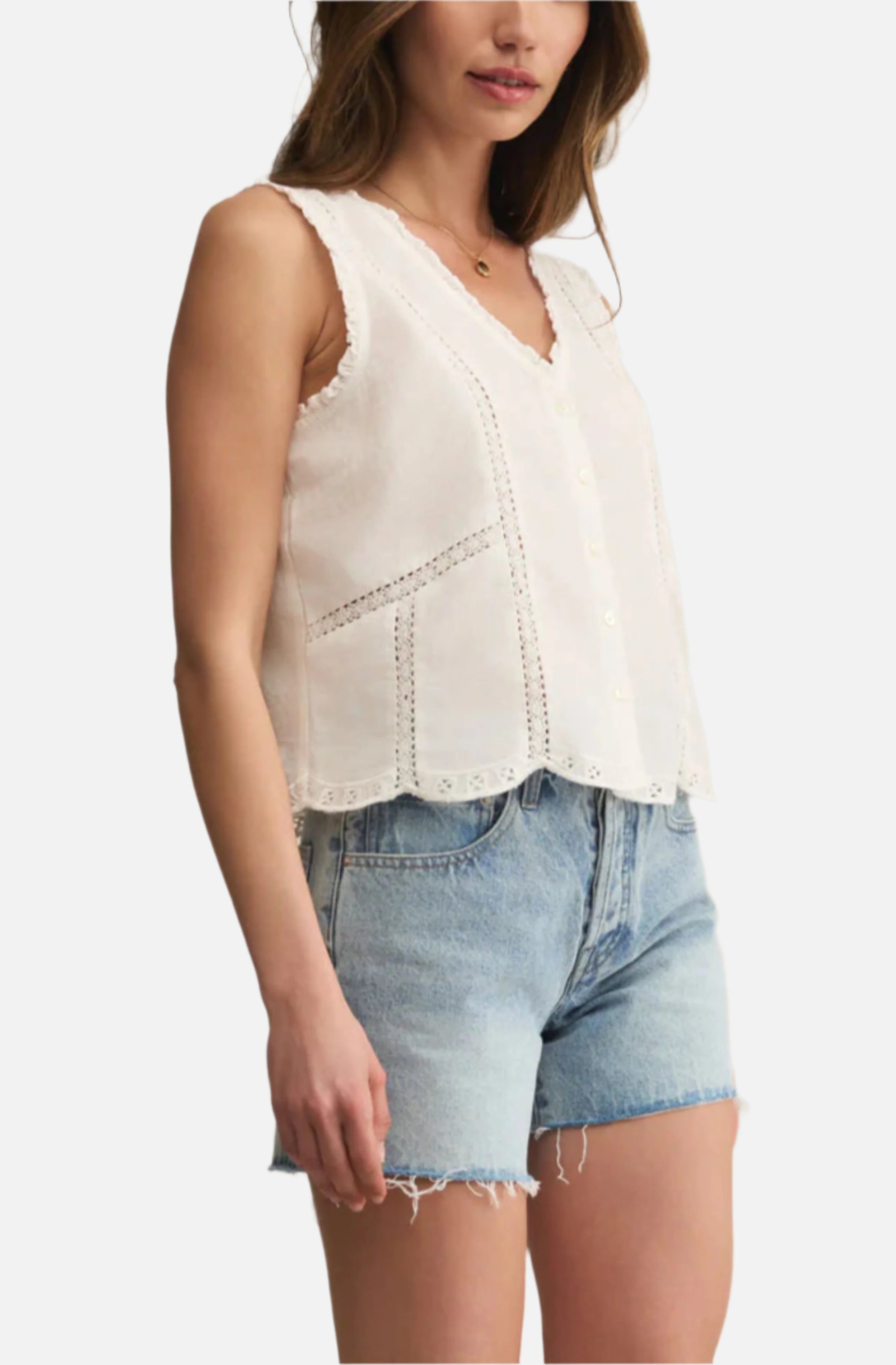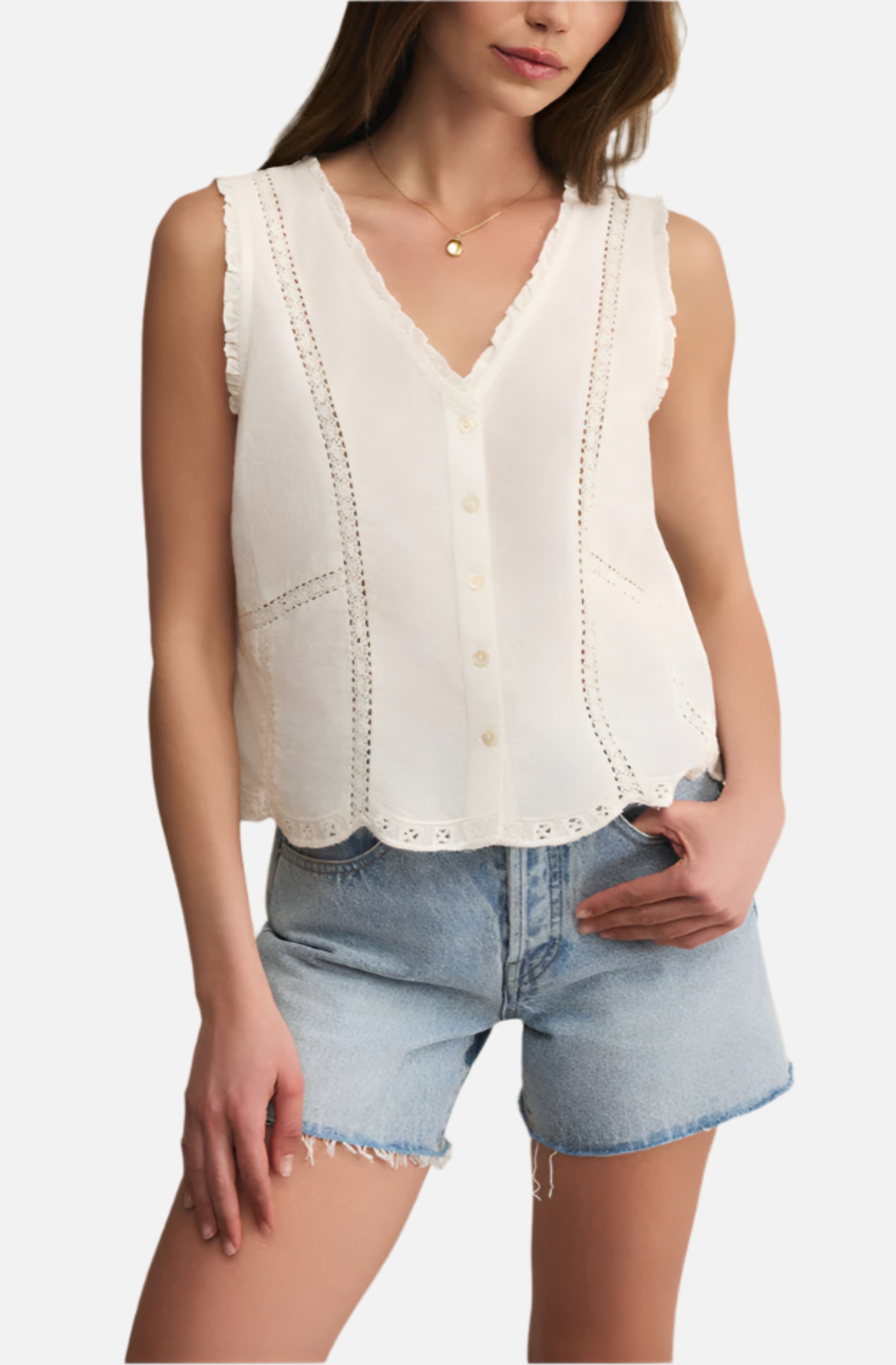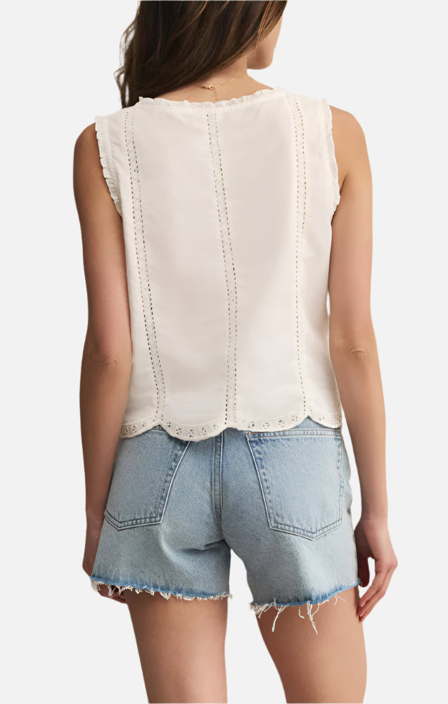 Airy cotton, embroidery details, and a touch of lace make this sheer tank a standout. The ruffled edges and scalloped hem add a fun, feminine finish.